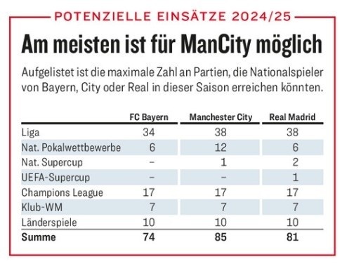 上赛季在极端情况下,曼城球员需要踢85场,皇马球员要踢81场,拜仁球员要踢74场。不过,由于三支球队的杯赛(欧冠&世俱杯)行程结束较早,球员们躲过一劫。