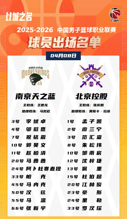 虎扑04月08日讯 今晚CBA常规赛,北控对阵南京的大名单已经公布。